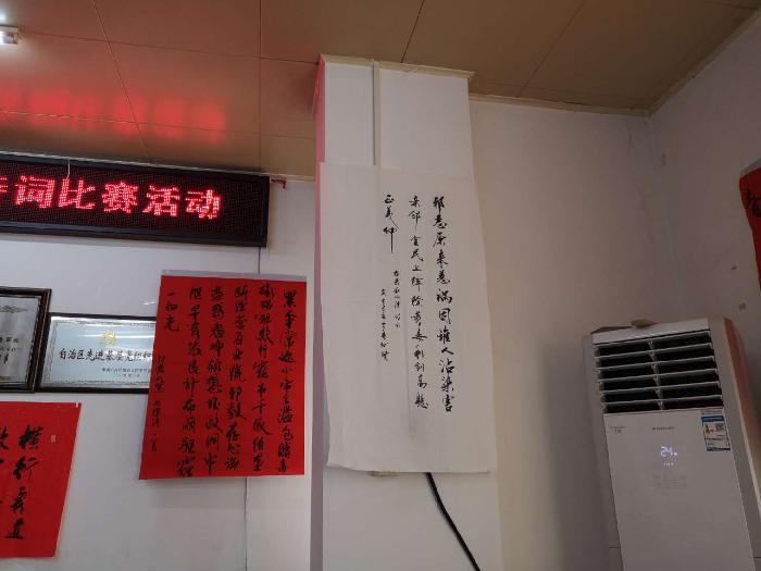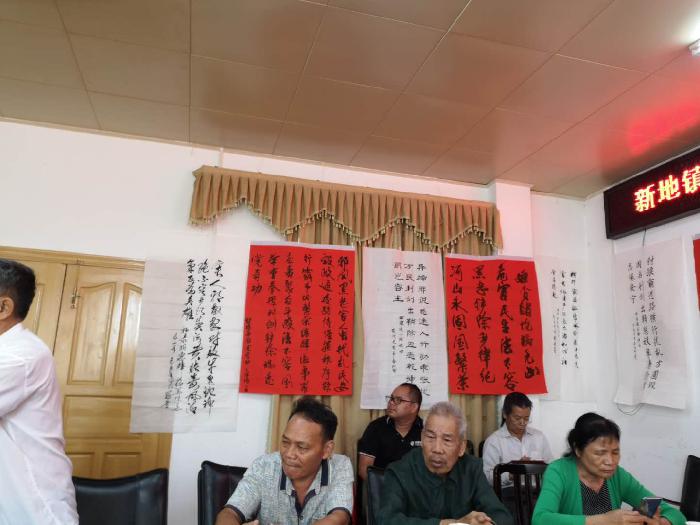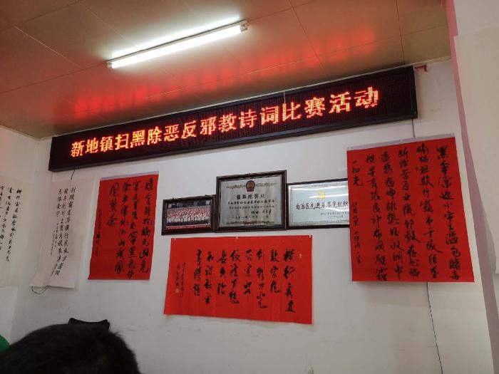 当天,记者在大会现场看到,周围展示着诗社成员用毛笔字书写的"扫黑除恶""反邪教"内容的诗词作品,为大会营造了浓厚的氛围。新地诗社的成员及当地村民齐聚一堂,对诗词作品进行诵读和欣赏。