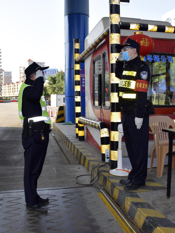 是日,在防疫检测卡点值守的禁毒大队老民警李少林等来了接替自己工作的儿子李浩铭。在交接工作结束后,老李和小李互相敬礼。在离开卡点前,老李站在一个角落边上,远远地看着小李进入工作状态,才安心地转身离开卡点。
