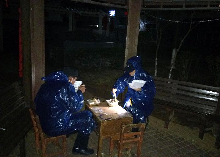 【镜头三】2020年1月中旬以来,龙圩区龙圩镇个别小区出现了部分住户与新型肺炎确诊患者曾有密切接触的情况,为维护秩序、做好政策宣传工作,龙圩区公安分局禁毒大队按照上级、区党委政府的统一部署和安排,立即调动分配警力前往各疫情防控隔离点进行值守看护工作。1月30日(年初六)傍晚7时许,天寒地冻,夜幕降临。在龙圩区某一隔离点的凉亭内,在岗值守的龙圩区公安分局禁毒大队的民警张译予和辅警陈勇安正在进行着他们独特又不寻常的“烛光”晚餐……