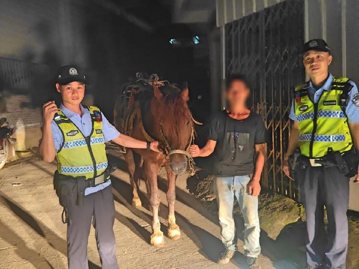 “警察同志,我自家的一匹马走失了,我们找了两个小时还没找到,平时全靠它跟我上山干活,麻烦你们帮帮我……” 5月13日晚,梧州市公安局龙圩区分局综合警务大队接到群众陆先生报警求助。