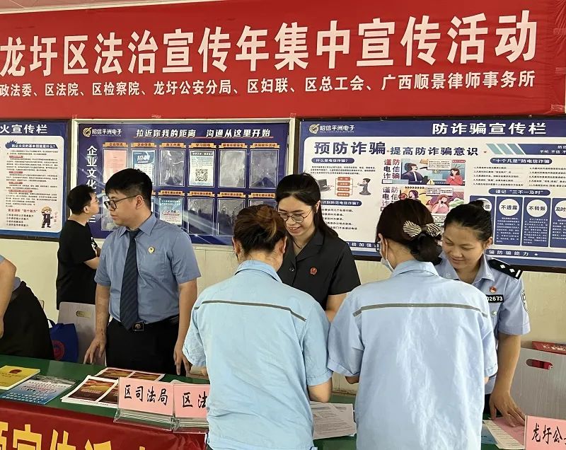 “法治是最好的营商环境”。2024年5月是第4个“民法典”宣传月,为进一步优化法治营商环境,提升企业防范和化解法律风险能力,提高企业职工的法律素质和法律意识,扎实推动《中华人民共和国民法典》深入人心,让民法典走到群众身边、走进群众心里,5月29日上午,龙圩区法院参加了龙圩区“美好生活•民法典相伴--法律进企业”宣传活动,在政法委的指导下,与区检察院、龙圩公安分局等多部门在广西昭信平洲电子有限公司开展了一场具有针对性和实效性的民法典普法宣传活动。